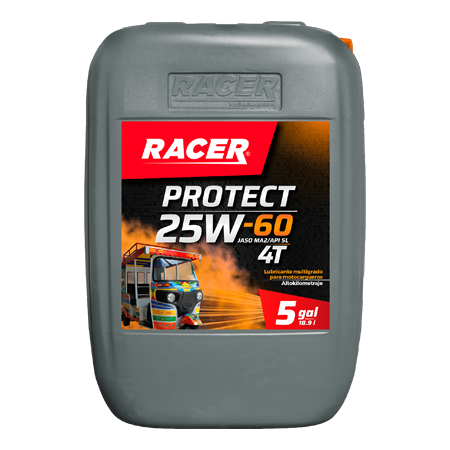 RACER PROTECT 4T SAE 25W-60 JASO MA2/API SL, es un aceite multigrado elaborado a base de aceites básicos vírgenes de tipo parafínico, un paquete de aditivos de tecnología avanzada que le proporcionan propiedades detergentes, baja emisión de humo y un mejorador de índice de viscosidad de alta resistencia.